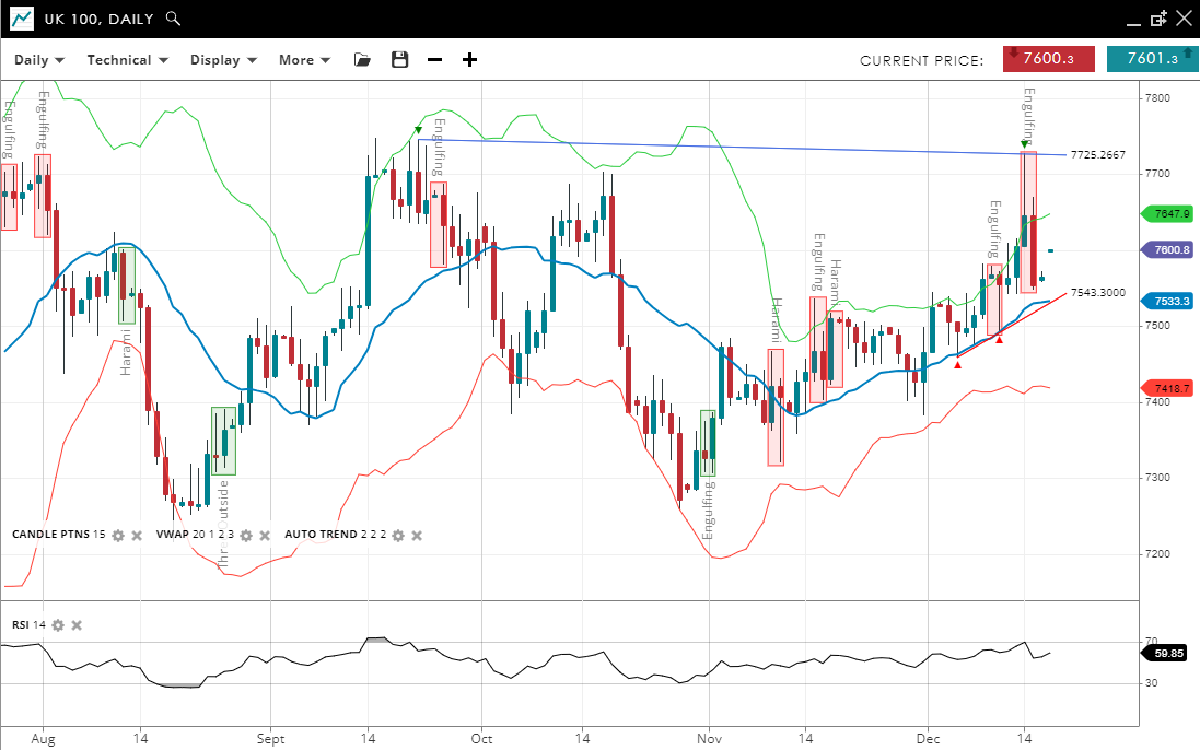 - The UK 100 remains in an uptrend, marked by price above its VWAP of 7,533.
