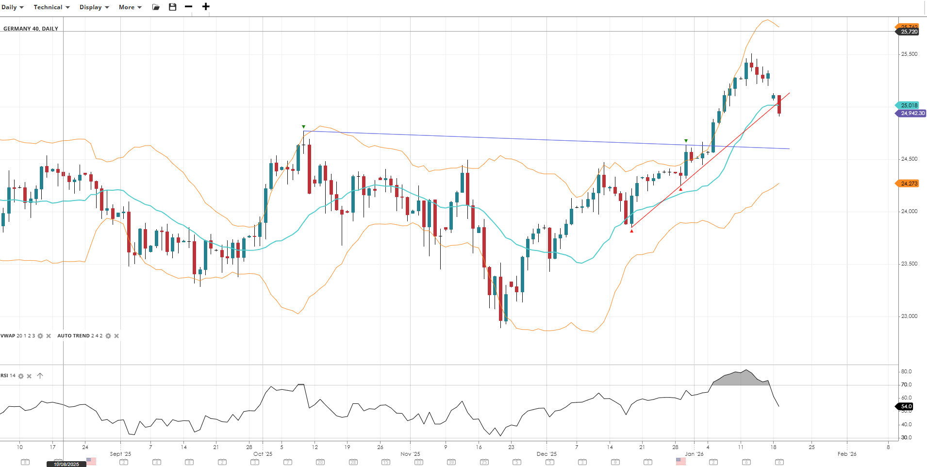 Germany 40 remains in a bullish trend and is currently undergoing a correction phase, trading at 24,942, slightly below its VWAP of 25,018. The RSI at 54.0 indicates mild bullish momentum. Support is at 24,273, with resistance at 25,720.