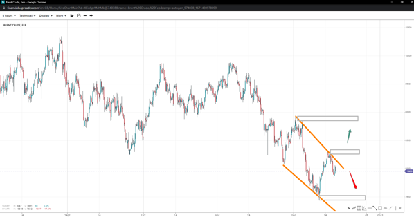 Brent’s downward structure reveals an overlapping price action resembling a potential falling wedge. If the upper trendline near 81.50 repels bulls, a fresh low a tad below the base at 75.00 might be seen. A break above the trendline might clear the path towards 90.00 if 83.20 gives in.