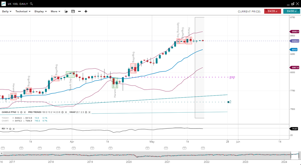 | UK 100 | Bullish | Impulsive | 8,429 | 8,312 | 8,067 | 8,556 | 74 |