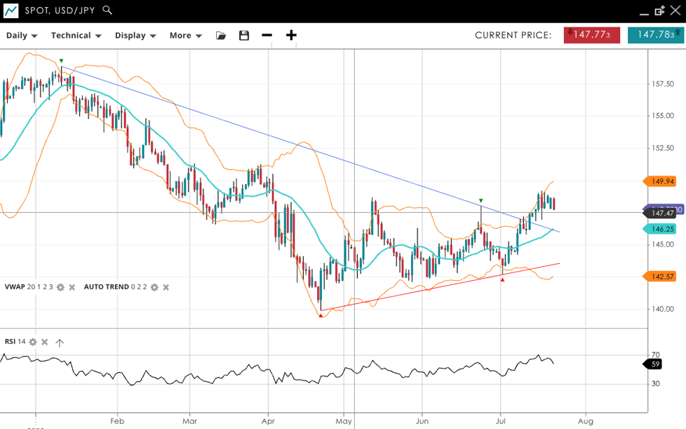 | USD/JPY | Neutral | Range | 147.78 | 146.25 | 142.57 | 149.94 | 59 |