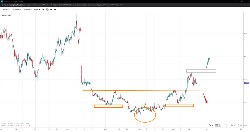Sonos stock price has left the right shoulder of an inverse H&S pattern on the rearview mirror. $19.20 is the projected target when measuring the height of the head-to-neckline from the breakout point. In the short term, the stock consolidates in a triangle or a pennant. $18.25 must break for any attempt higher. Contrarily, losing the neckline at $16.40 might send the stock back to the shoulder low of $15.00 unless it slides to the bottom at $13.60.