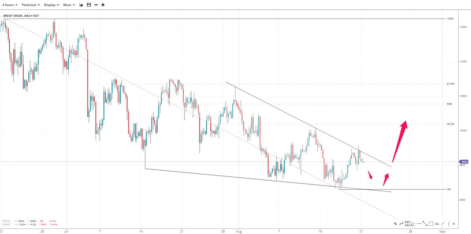 UKBRENTOIL continues to descend in a diagonal pattern after bears added to their shorts near the 98,00 trendline resistance. The market could revisit the previous low at 91.50 where we expect a double bottom after a false break towards 90.00 to incur. A close above the trendline resistance could signal a reversal with the first target above triple digits.