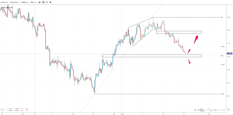 Gold continues to decelerate towards 1,750 after successfully printing a reversal diagonal pattern. If more sellers join the trend below the 50% Fibonacci price could be led toward the 1,730 golden ratio next. A move and close above 38.2% near 1,770 would increase bullish bets toward 1,800. Gold could range until a breakout adds to either up or downward bias.