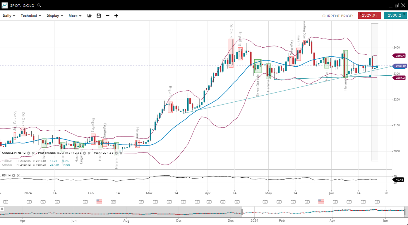 Gold remains in a bullish trend trading sideways in a neutral consolidation since topping in mid-April, with the price recently increasing to 2,330, now around the previous VWAP of 2,329. Support has adjusted higher to 2,284, while resistance has decreased to 2,369. The RSI has increased to 49, indicating a moderation of bearish momentum compared to the previous report.