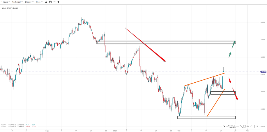Wall Street broke the 30500 range-top with the pullback from 31400 increasing the chances of a 30000 retest. The successive higher-highs and steeper higher-lows resemble a completed rising wage, where the range to 30840 opens the door to 33000. If the 30k handle is lost, 28550 comes back in focus.