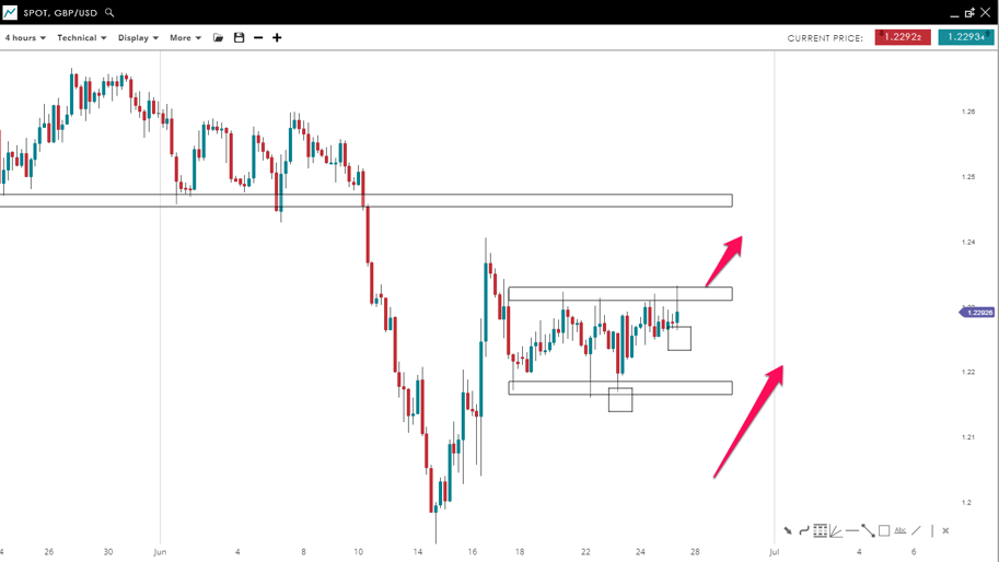 Cable is bouncing inside a parallel channel formation which is made from a key support and resistance levels with the following price values: 1.21 & 1.23. A higher low is posted inside this pattern signalling that the buyers are in control of the market which pushed the price to test the 1.23 mark. If the bulls break this zone and close above it this could lead to a move higher towards 1.24.