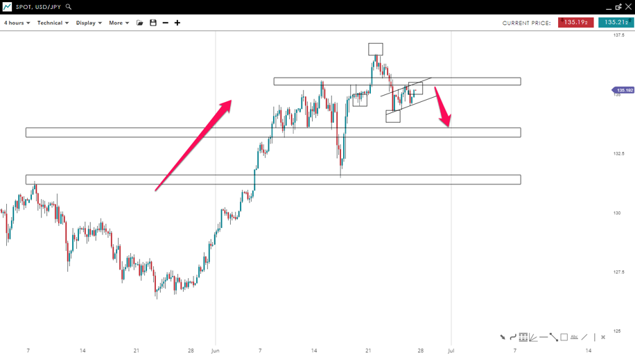 The price of “USD/JPY” failed to continue its move above the 135 resistance level. We have a lower low and a lower high, signalling that the sellers are about to reverse the market. A rebound to the resistance zone (135) could happen to bring back liquidity before a new bearish impulsive toward the 133 mark.