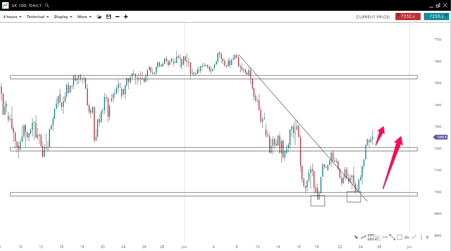After breaking the bearish trend line to the upside and posting a double bottom formation, the “UK 100” managed to reverse and move higher. On the daily time frame, the last bar broke and closed above the pivot level. This could lead to a further move to the upside toward the next key resistance level around 7,525.