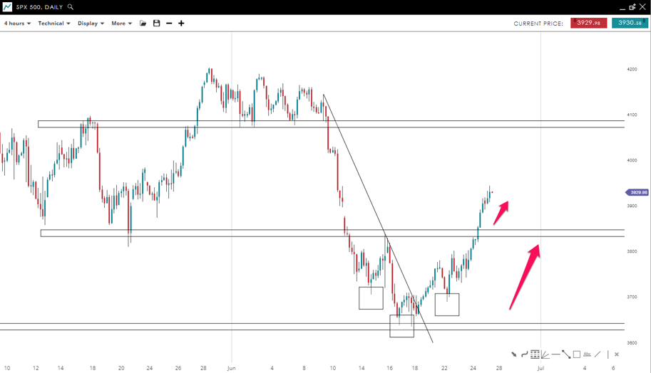 Buyers successfully broke the bearish trend line to the upside after an inverse head and shoulders, which led to a reversal and a move to the upside. The market also broke and closed above the resistance level (3,840) which shows that the buyers are in clear control of the market. What we could see in the coming days is a further movement to the upside toward the 4,080 mark.
