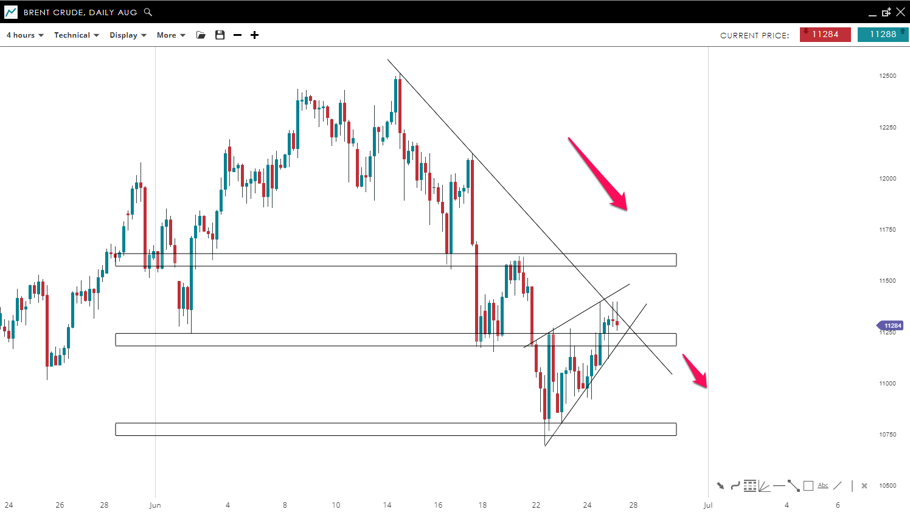 Brent Crude Oil is currently testing an area of confluence made from the higher end of the bearish flag pattern and the bearish trend line. The sellers are showing strength since two bars with long upper wicks are left near the resistance level. This could lead to a breakdown of the bearish flag and a move to the downside toward the 107 mark.
