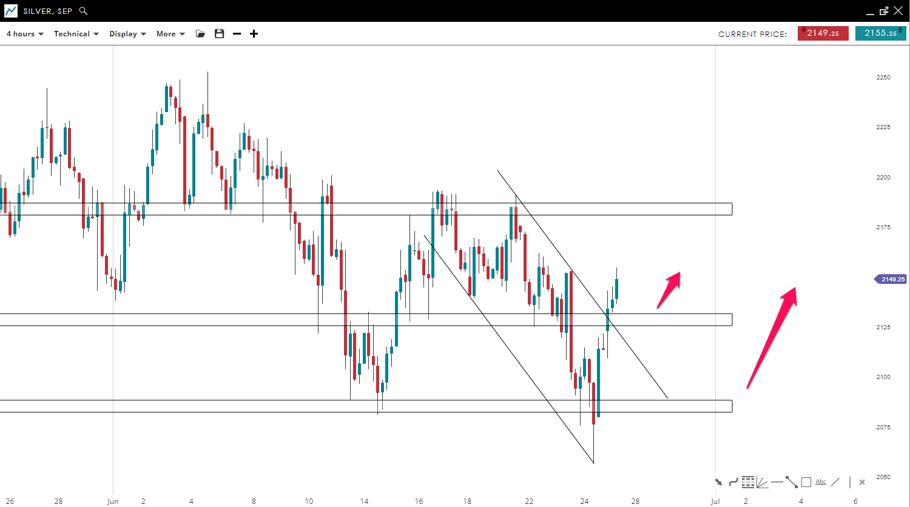 The price of “Silver” successfully broke the bearish trend channel pattern to the upside after the buyers took control of the market around the 2,085 mark. Silver is currently trading above the pivot level (2,125) where a further move to the upside is expected toward the 2,185 mark.
