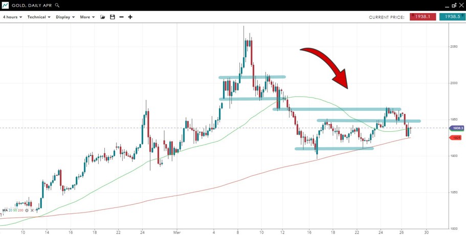 The gold price is currently supported by the 200 SMA but a failure to hold above the recent high at 1950 suggests a possible break lower inline with the sell-off from the near-record high.