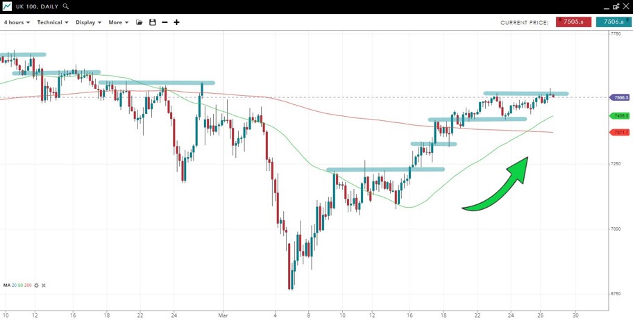 The UK 100 price continues to trend higher above both the 50 and 200 SMAs but is trapped underneath the March 23 at 7520.