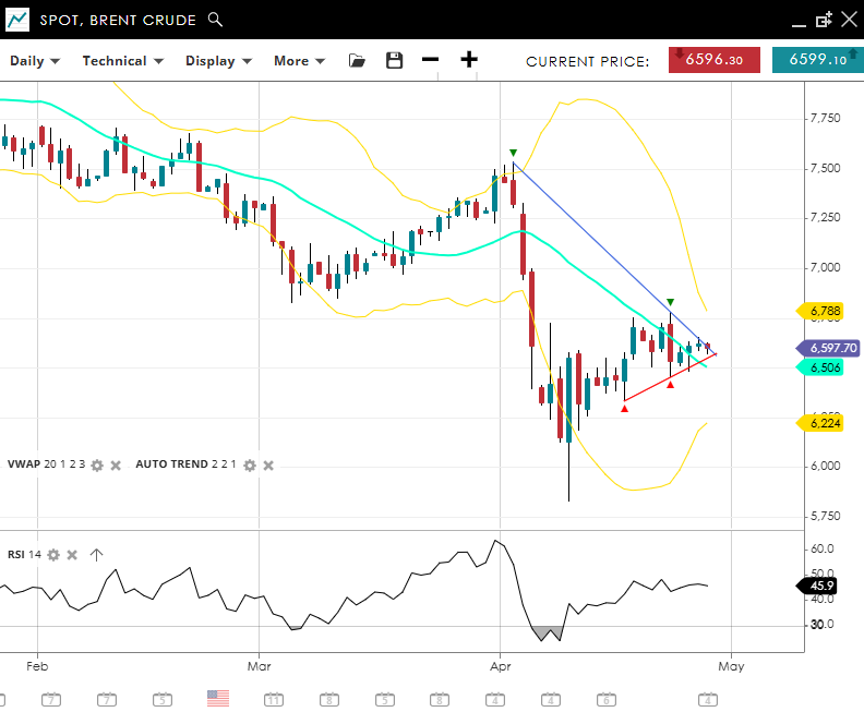 | Brent Crude | Bearish | Correction | 6,599 | 6,506 | 6,224 | 6,788 | 45.9 |