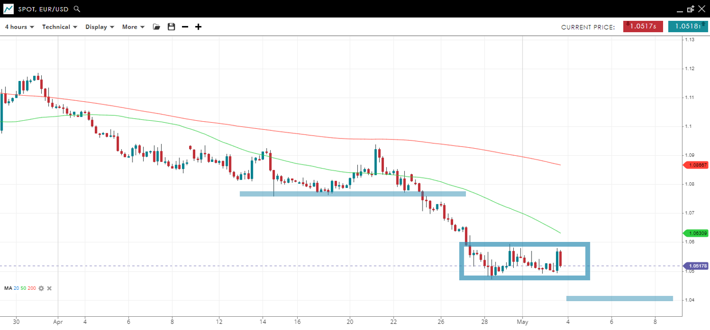 The price is consolidating in a rectangle above the big 1.05 level. A breakout either side of the box will determine the next direction. The bias is bearish while the price is under 1.075.