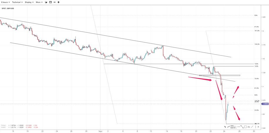EUR/USD pulled back to 0.9700 after plummeting to the 161.80% Fibonacci of 1.0370-0.9860 at 0.9550. Near the bottom channel, a rejection might send prices down to 0.96000 and eventually 0.9500 if the record low softens. But if the channel gets penetrated while the pair trades above the 138.2% Fibonacci near 0.9670, 0.9800 is firm resistance.