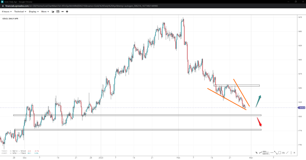Gold is approaching the round support of 1800, offering an opportunity for short covering to 1827 and even 1855. If bulls fail to hold the line, the commodity could fall to 1780 next, where chances for some respite will increase. Ideally, a wedge pattern would support the upward bias.