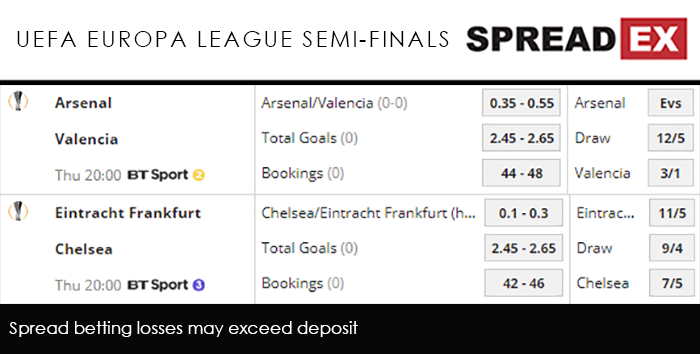 Somewhat fortunately, Valencia are also in a bit of a dry spell, losing their last 2 La Liga games to Atletico Madrid and Eibar. As for the Europa League run, they entered the competition after being dumped out of the Champions League group stages, beating Celtic, Krasnodar and Villarreal on route to the semis. With Pierre-Emerick Aubameyang – who is vying for the Golden Boot in the Premier League – at a Super Mega PGM of 42-49, the Gunners will be hoping to nose ahead on Thursday, with Spreadex offering an Arsenal/Valencia Goal Supremacy spread of 0.35-0.55, alongside a Total Goals spread of 2.5-2.7. While not quite as severe as Arsenal’s nosedive, Chelsea – who travel to Eintracht Frankfurt at 8pm on BT Sport 3 – are also without a win in their 3 games. A mid-April loss at Liverpool was followed by draws against Burnley and Man United; yet thanks to the failings of those around them, the Blues have managed to cling onto 4th place in the league. Though they almost messed up in the 2nd leg of their quarter-final against Slavia Prague, Chelsea have tended to save their best form for Europe, with 11 wins and one draw across the competition so far. Frankfurt have been also as strong, with victories over Lazio, Marseille, Shakhtar Donetsk and Inter Milan. Their one defeat came at Benfica, and even then the 4-2 finish helped them go through on away goals after winning 2-0 at home. Having banged in 25 goals this season, including 8 in the Europa League, Luka Jovic leads with a Super Mega PGM of 30-36, ahead of Eden Hazard’s 25-30 and the 20-24 shared by Olivier Giroud and Gonzalo Higuain. The Blues should be able to continue their unbeaten streak in Europe, with Spreadex offering a slender Chelsea/Eintracht Frankfurt (h) Goal Supremacy spread of 0.1-0.3, alongside a Total Goals spread of 2.45-2.65.
